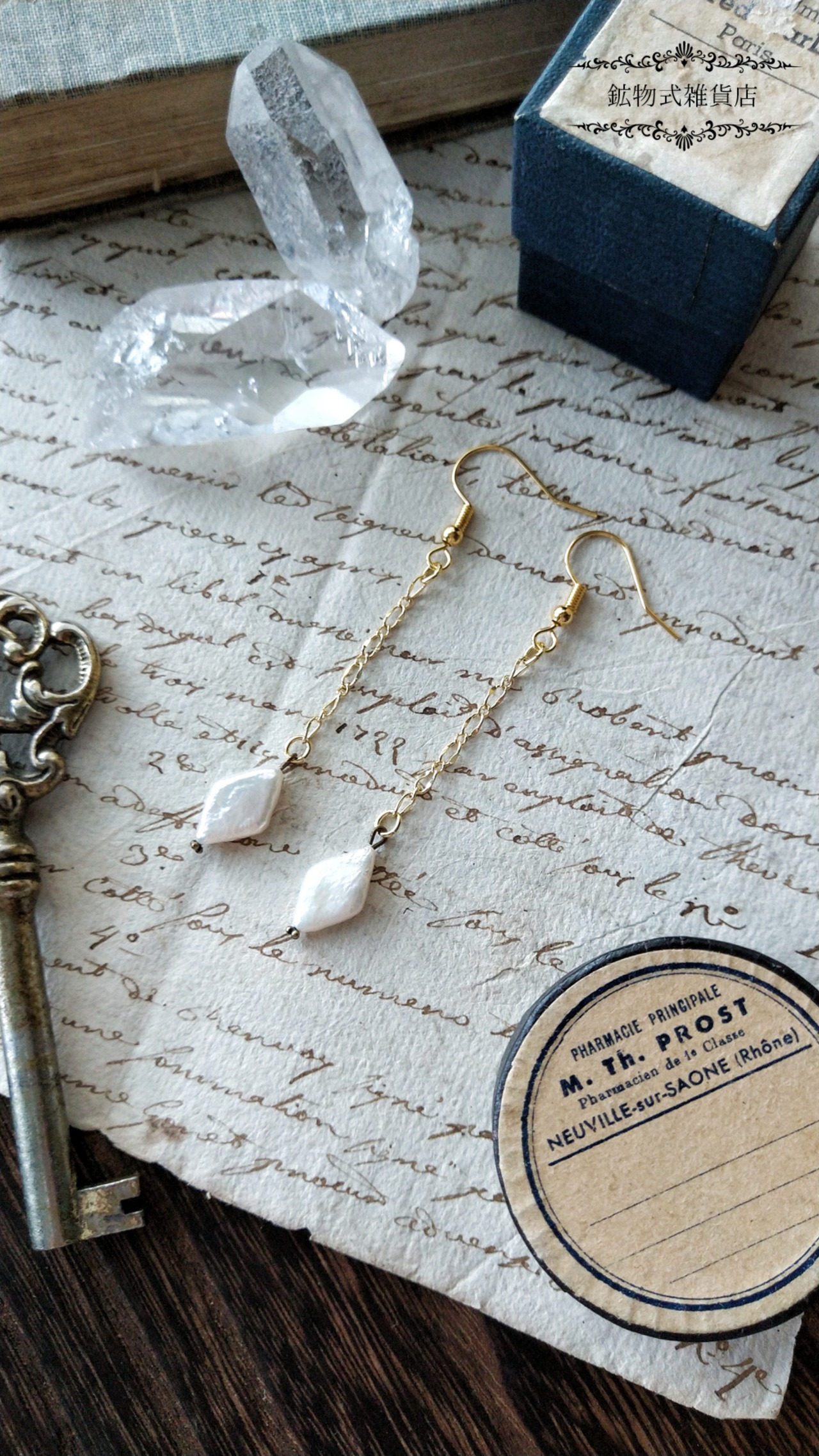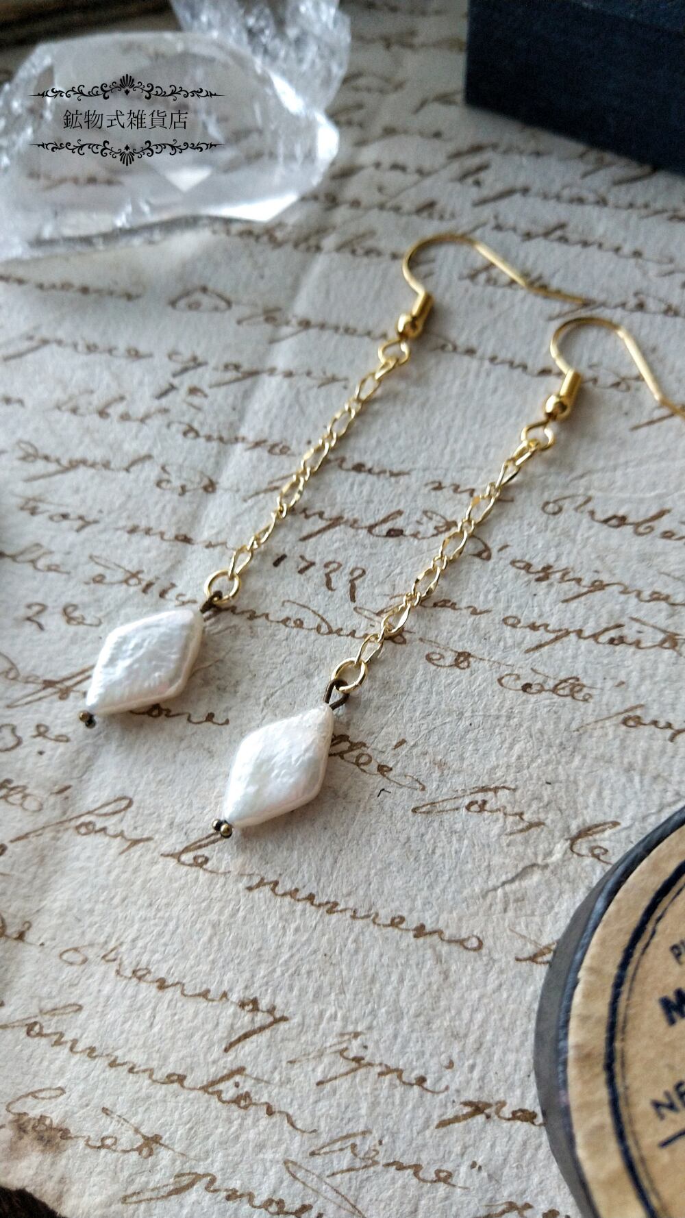 ひし形の淡水パールを、ゆらゆら揺れるピアスに仕立てました*